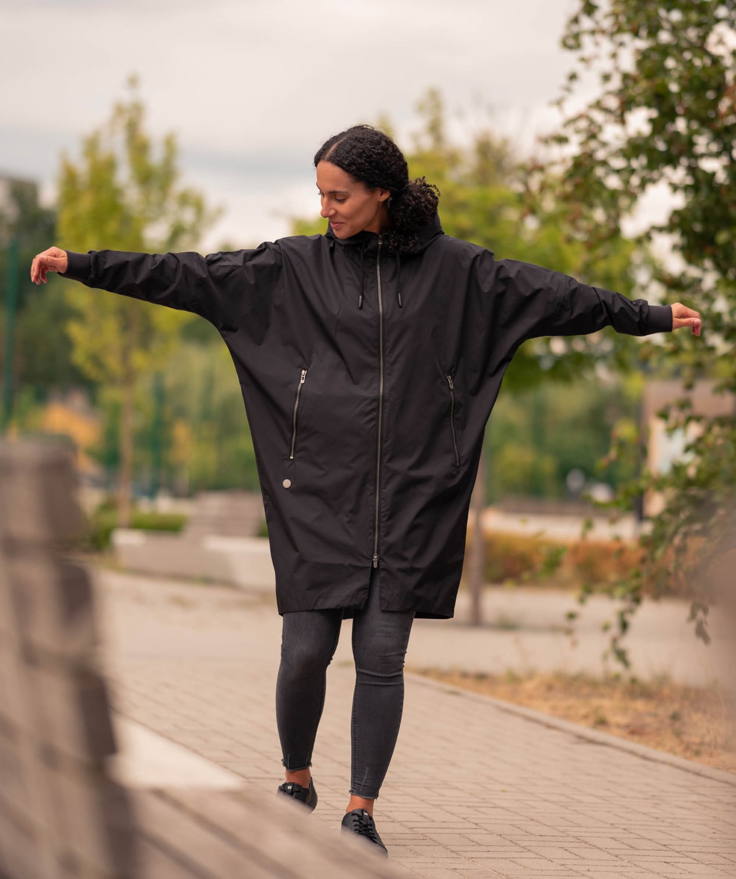 - netopýří střih s velkou kapucí a spadlými rukávy, které jsou zakončeny úpletem